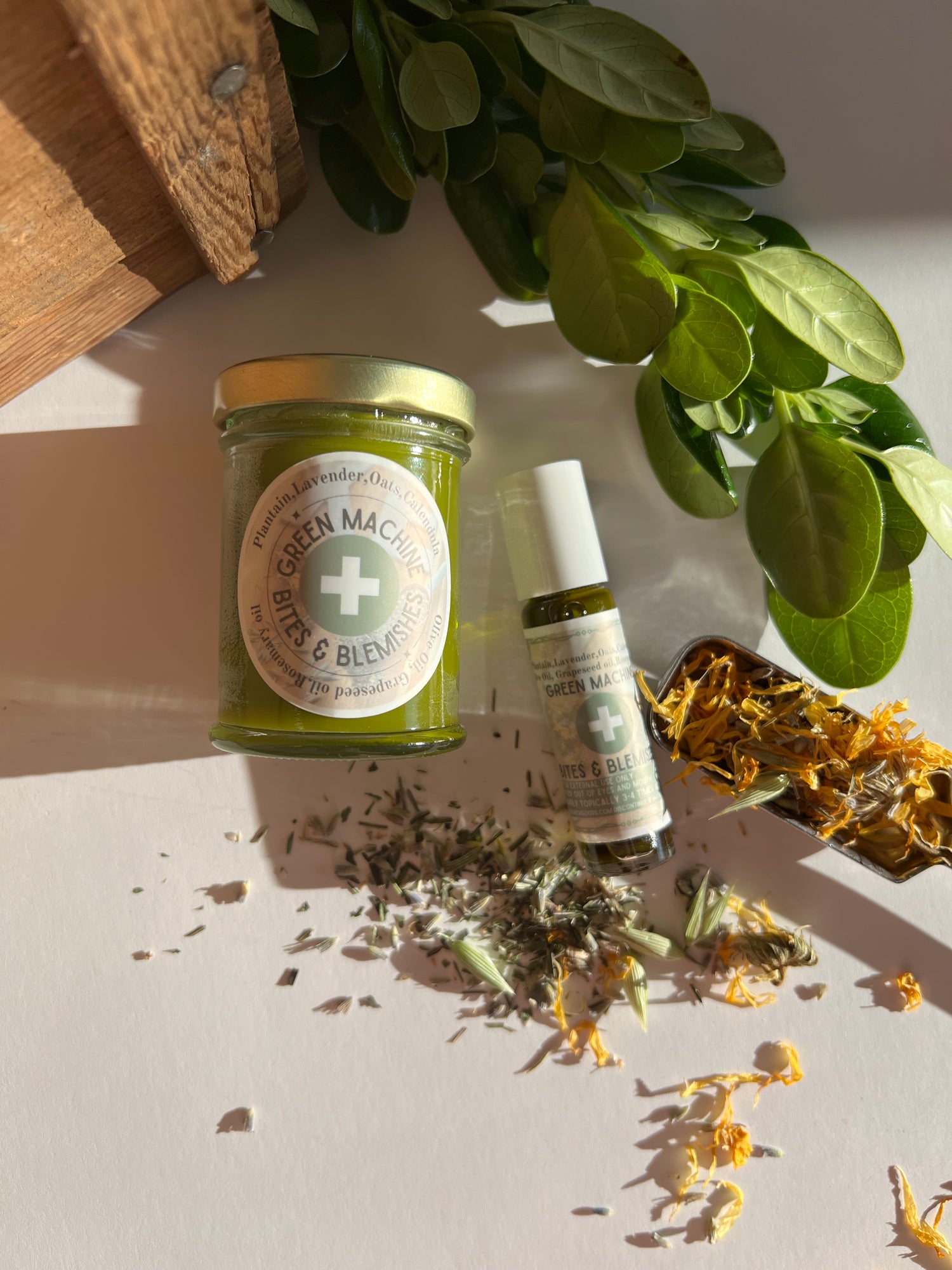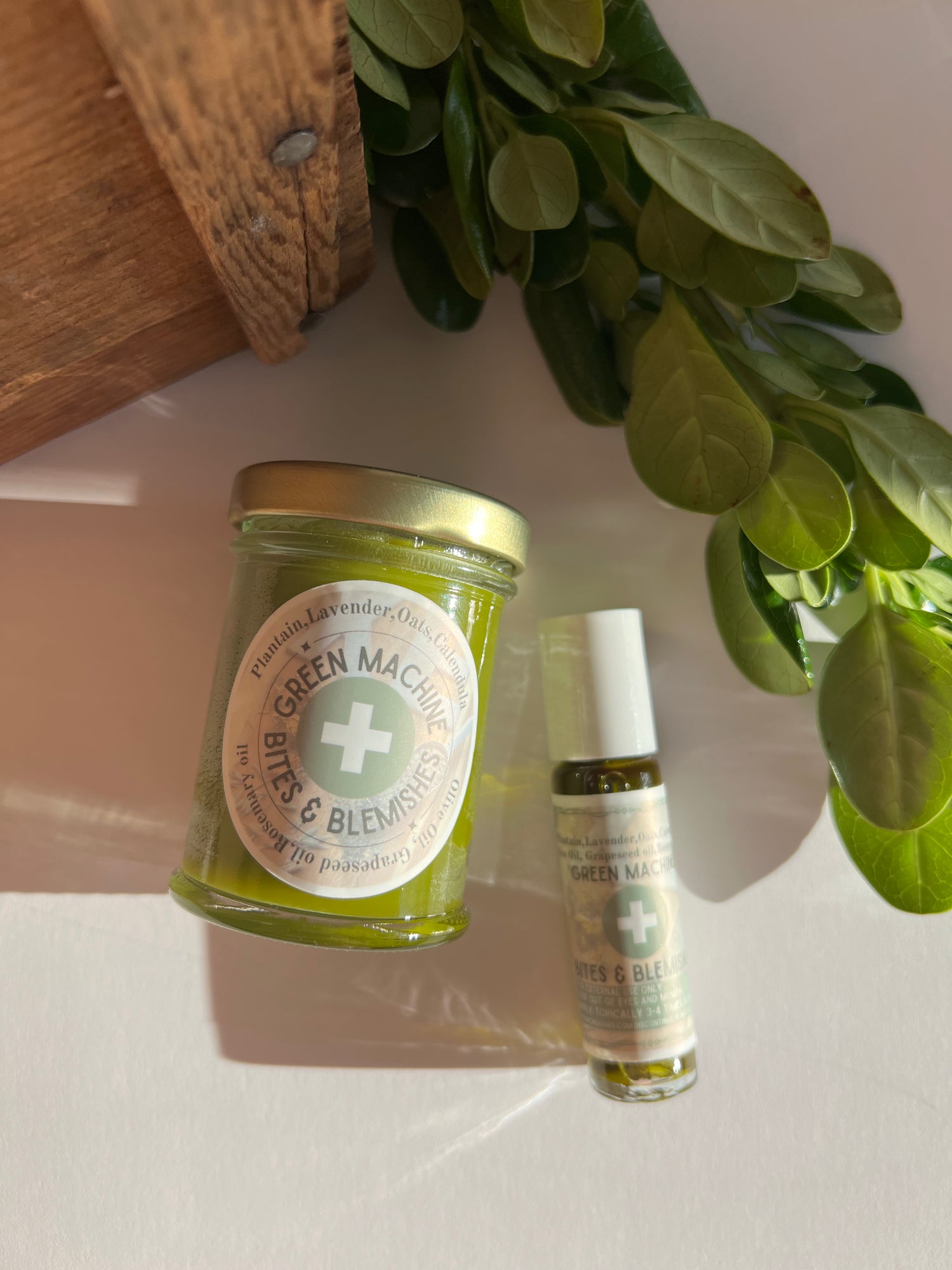 Green Machine is a special product made for bug bites and blemishes. Its a beautiful deep green color that comes from the Plantain Leaf. This oil is infused for hours, hand stirred with love every 20-30 mins. Then created into a balm with a small amount of beeswax. This product works best when applied to bite or blemish right away. Apply as often as needed. (I usually apply to my bites as soon as they start to itch again.) I like to keep my balm in the fridge sometimes and others times I carry it with me.