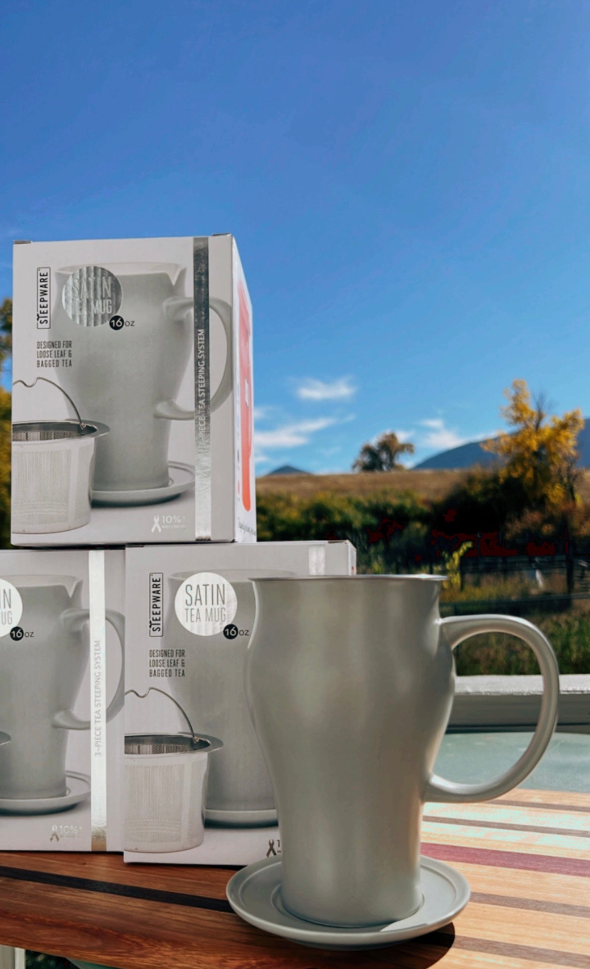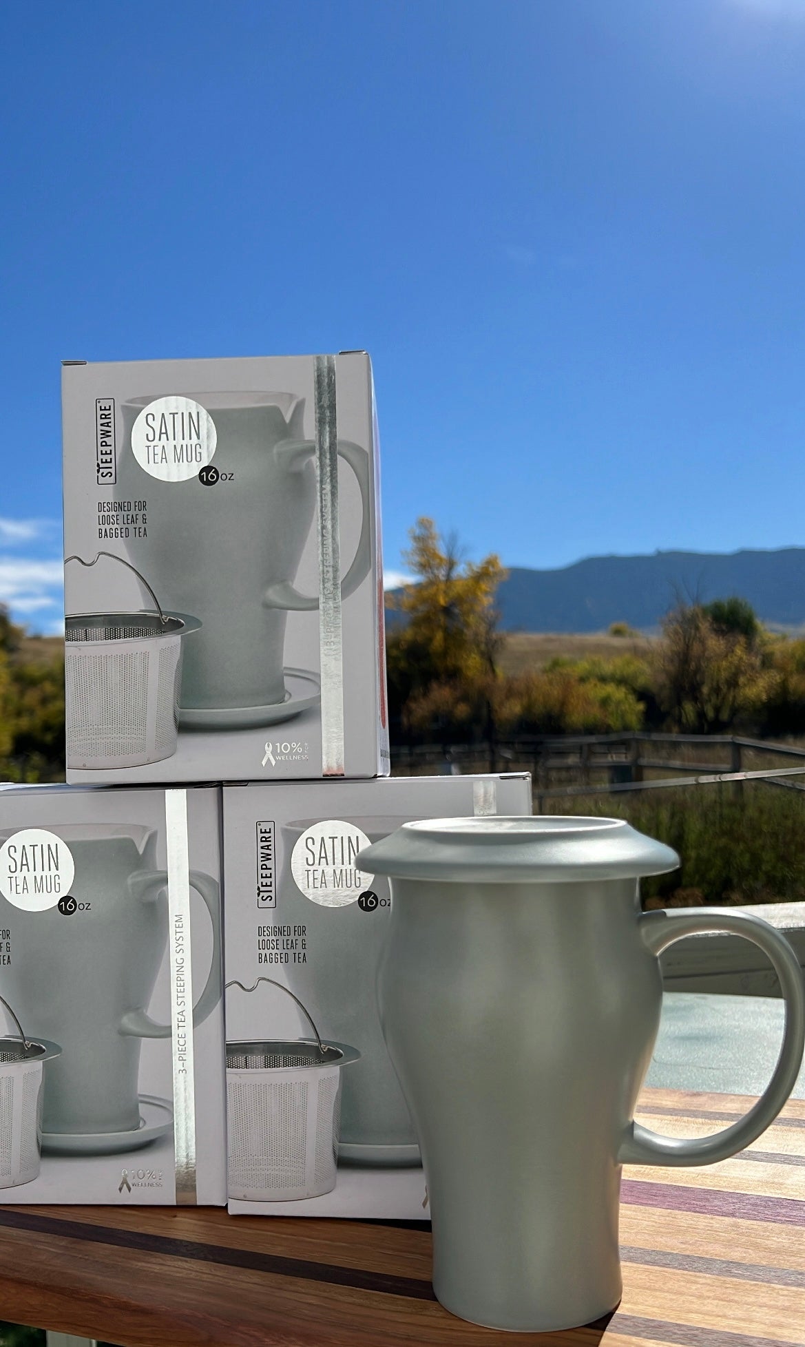 Enjoy a cup of loose tea with your new sage green mug. Infuser included. The best way to make a cup of tea.