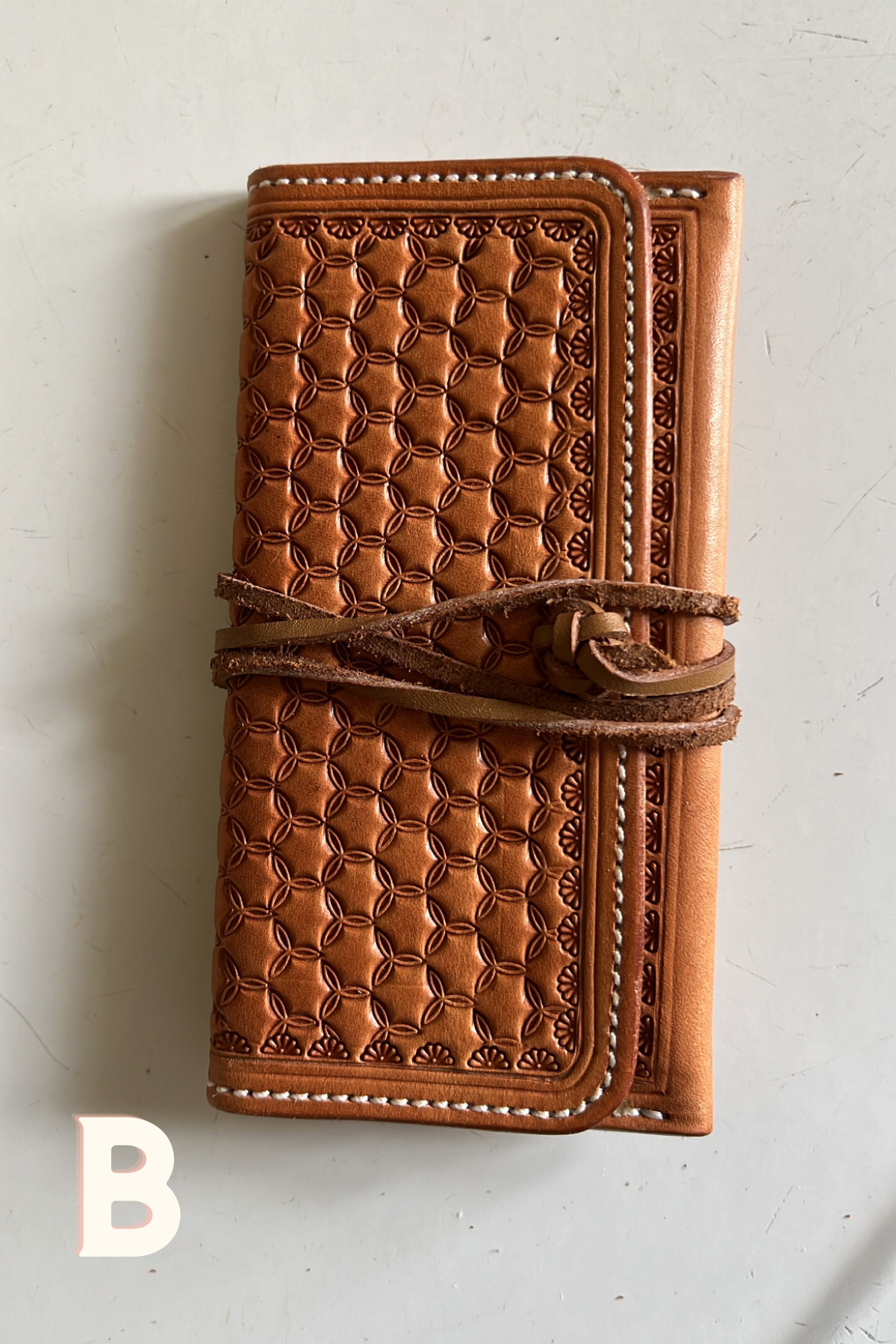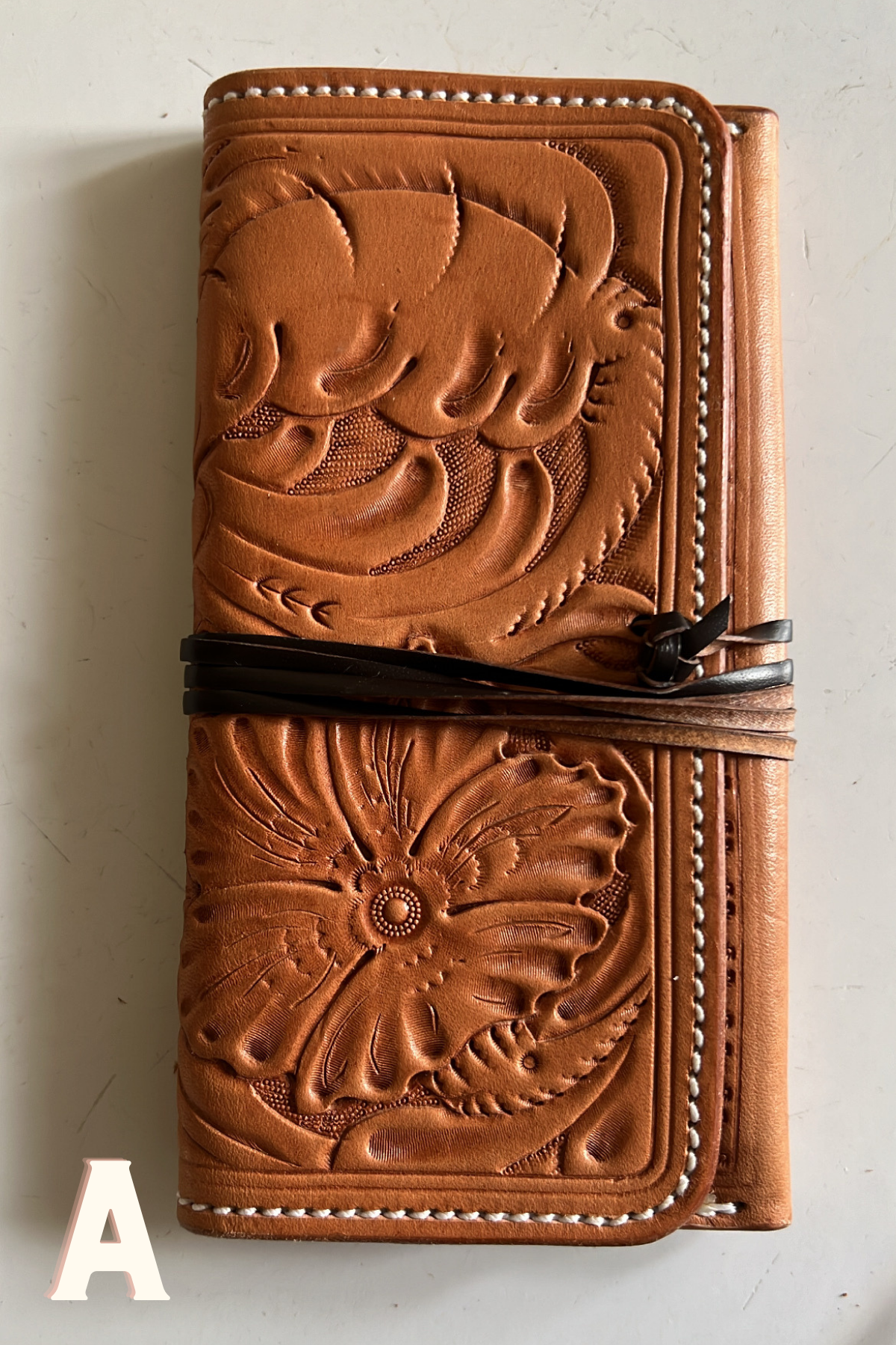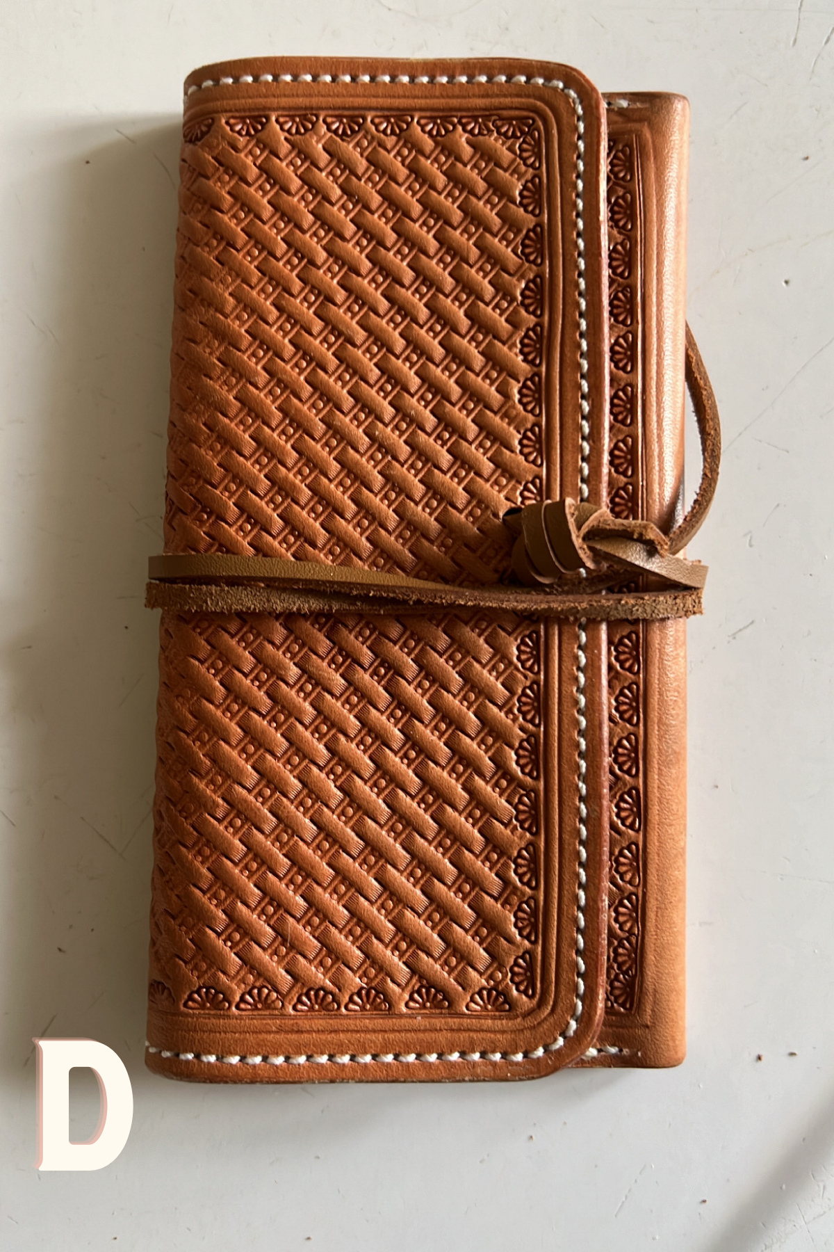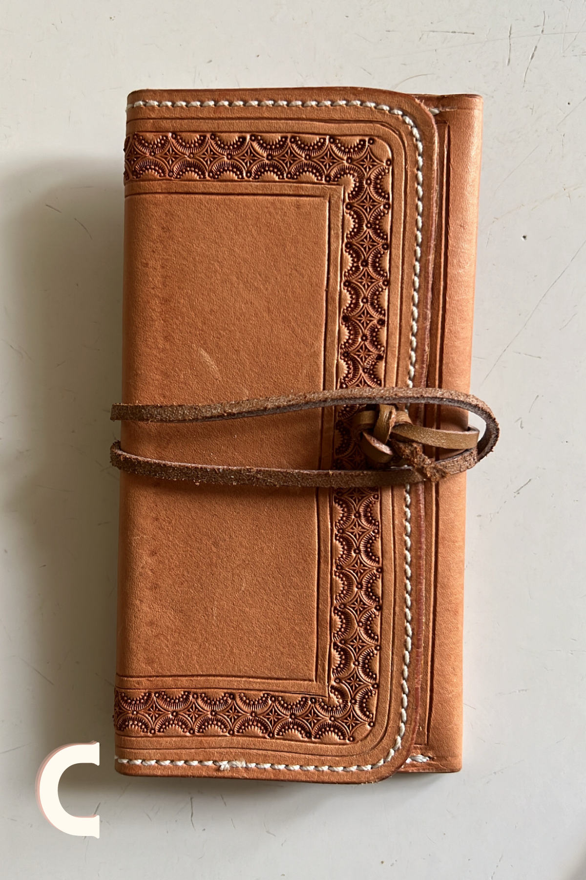 Hand stamped by a near and dear friend. Made with ladies in mind to put cards, Id, and small amount of cash. Can fit in the back pocket!